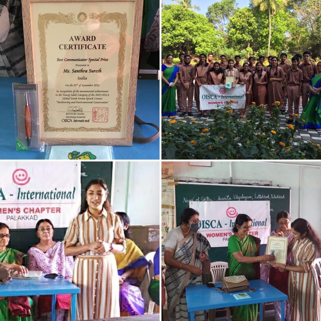 A grand function was held at Amritha Vidyalaya, Palakkad. Dr.Parvathy Warrier ,Vice President OISCA-South India presented the award to Ms,Sandra Suresh at Palakkad. Mrs.Anitha.T Secretary ,OISCA Women’s Chapter briefed the students about the contest and on the theme. Mrs. Jyothi Balachandran,Vice President, OISCA Women’s Chapter, Palakkad, Mrs.PriyaDevi, Mrs.Chandrika SreeKumar -Members OISCA,Women’s Chapter Palakkad and Mrs.Priya, Teacher In-Charge offered felicitations.